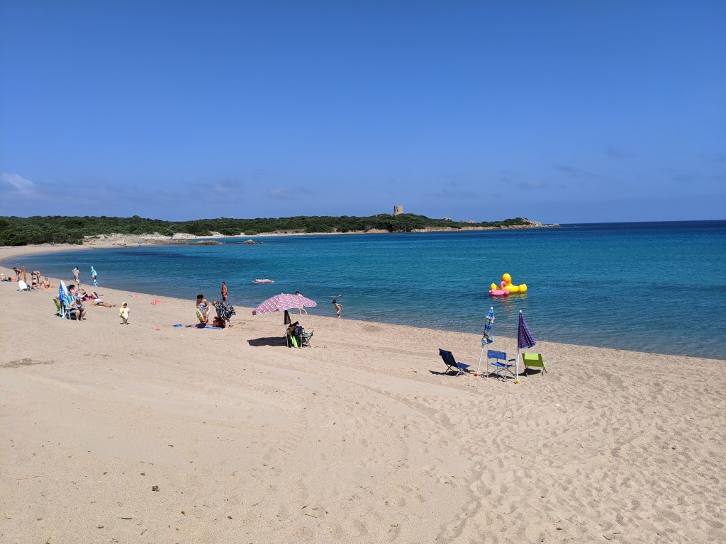 La seconda spiaggia, quella sotto la Torre, ha alle sue spalle delle dune sabbiose coperte dal bosco con la classica vegetazione sarda di arbusti alti al massimo 2 m. Guardando in fondo sulla destra di vedono in lontananza gli edifici del centro abitato che, comunque, non hanno un aspetto fastidioso.