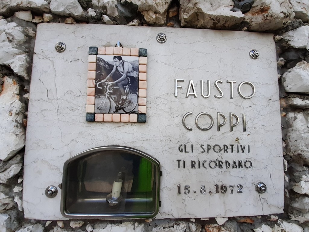 Una targa ricorda la data in cui è stata dedicata l’opera a Coppi (15.8.1972).