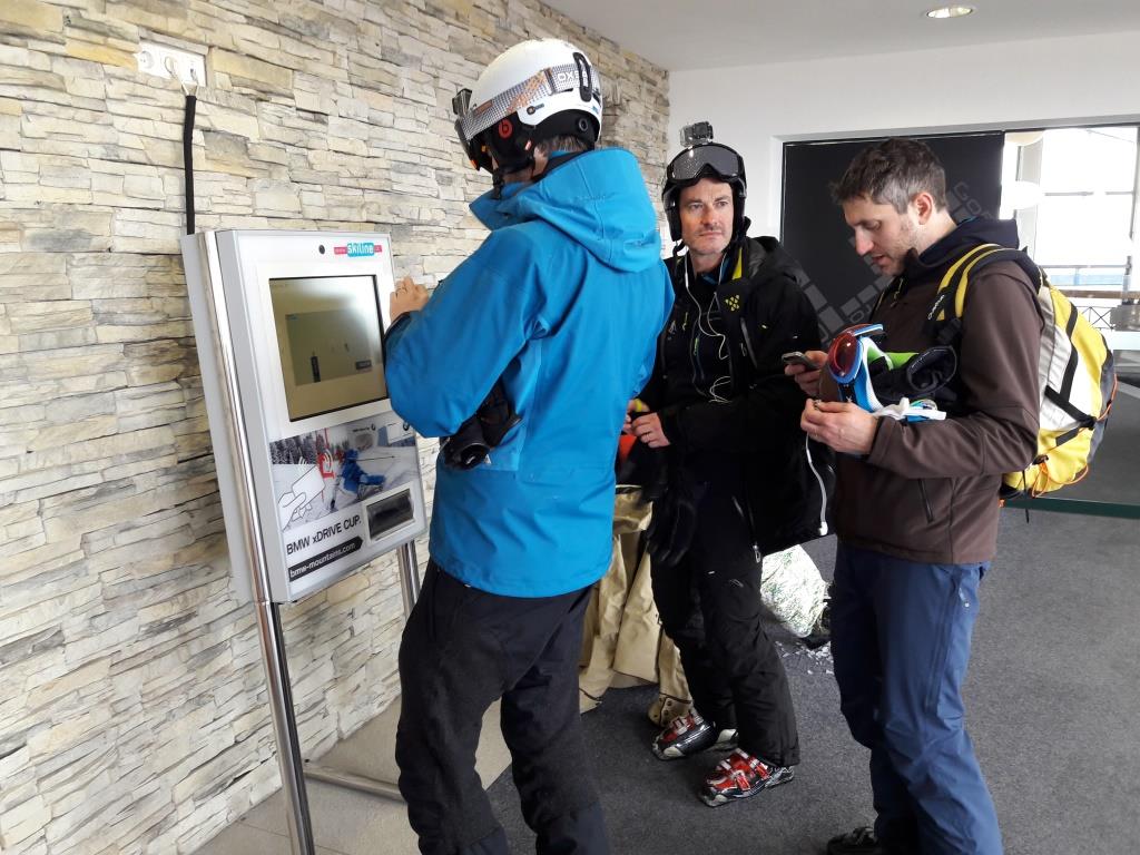 La seconda cosa da ricordare è che, in moltissimi punti del comprensorio sciistico, c’erano campi da slalom aperti al pubblico: c’era infatti un tracciato da slalom speciale, uno da slalom gigante, uno da carving, uno per misurare la lunghezza del salto. Ciò che abbiamo trovato notevole è che le sciate tra i pali non solo venivano cronometrate, ma altresì filmate. Passando lo skipass nei chioschi presenti nei rifugi, è possibile vedere il proprio video (nella foto qui sotto Gek controlla la propria performance).