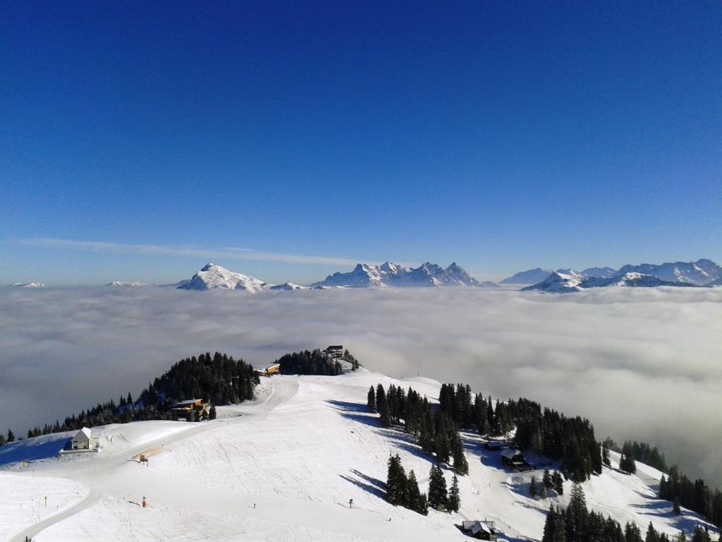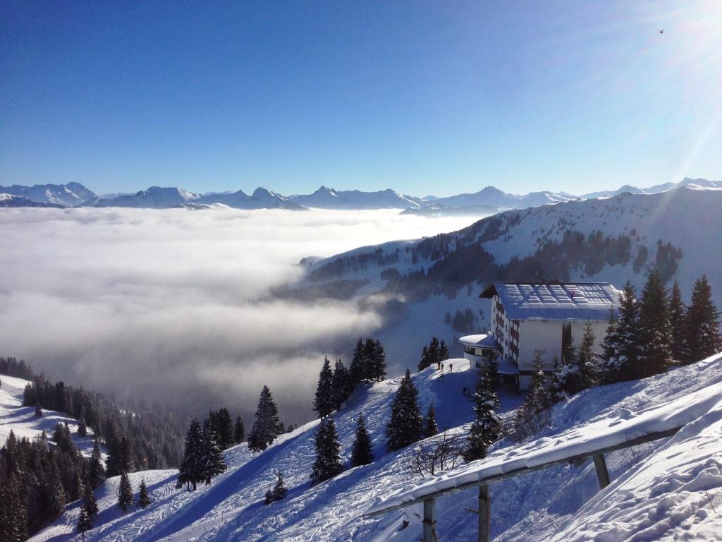 A metà della risalita abbiamo superato il livello delle nuvole e trovato il sole. Meraviglioso. Sciare con il sole sopra il mare di nuvole è una delle massime esperienze per uno sciatore.