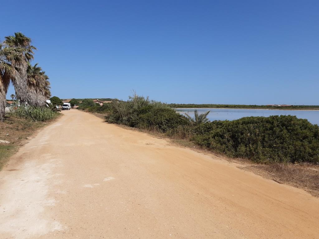 Tra la spiaggia di Putzu Idu e la omonima laguna c`e`un stretta striscia di terra dove passa la strada e ci sono parcheggi su fondo sterrato.
