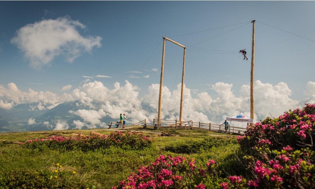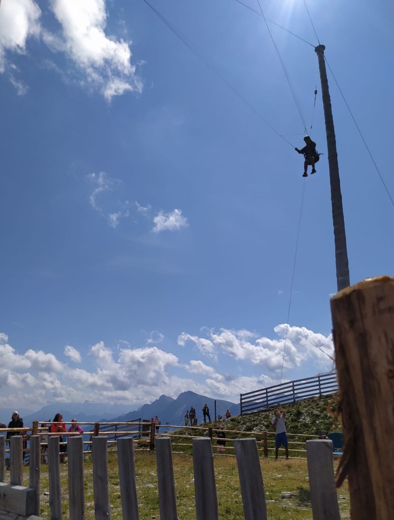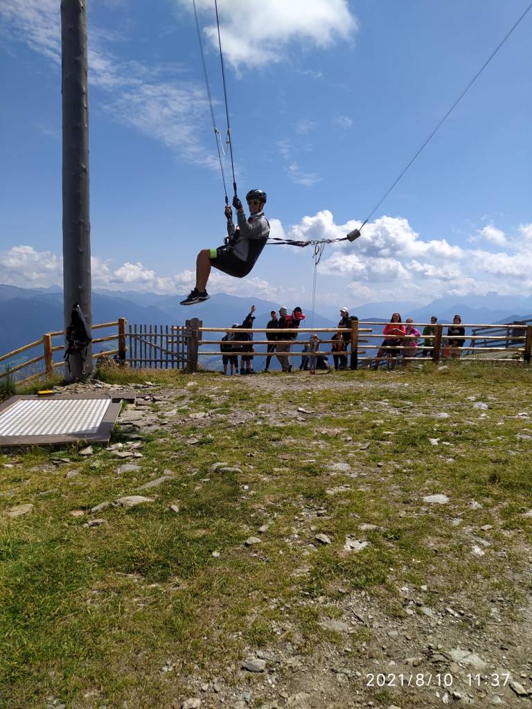La attrazione più adrenalinica è l’altalena gigante a quota 2.275 m. Dopo essere stati trainati da un verricello a 15 metri di altezza, ci si sgancia dalla fune di vincolo e, sospesi su due cavi d’acciaio, si viene lanciati nel vuoto (qui sotto una foto della struttura presa dal sito).