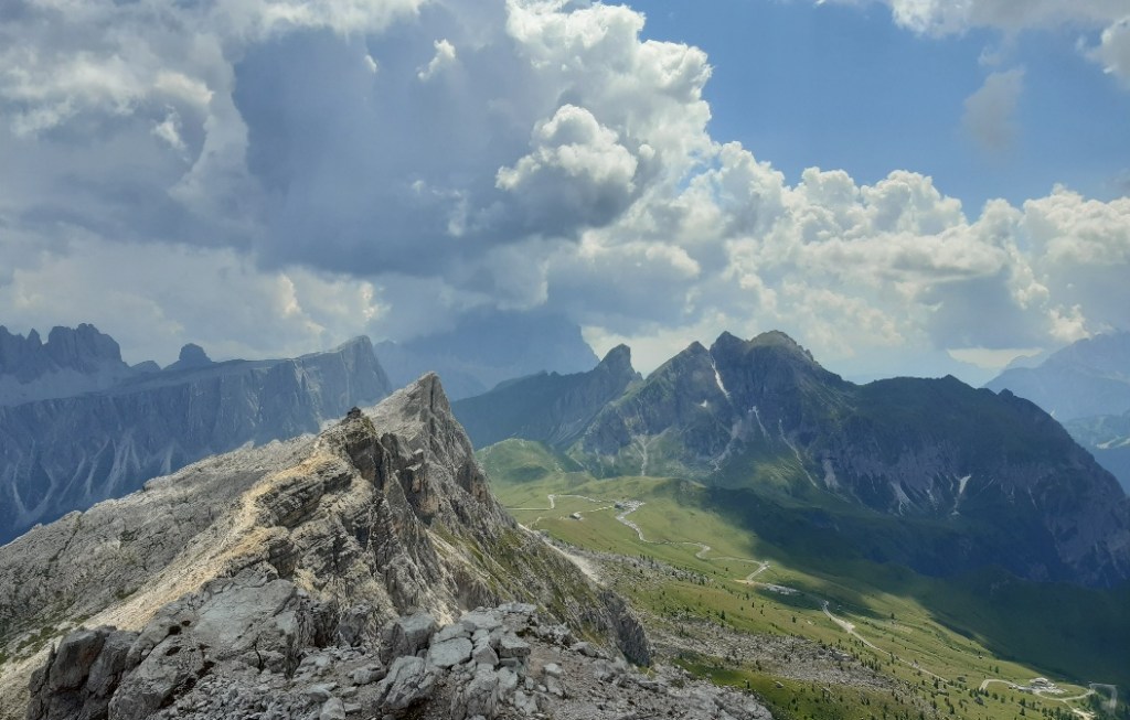 Superata la forcella, il sentiero prosegue in costa ai piedi del massiccio dell’Averau e la vista e` spettacolare: si può ammirare il Passo Giau e la Cima Fertazza sopra Alleghe.