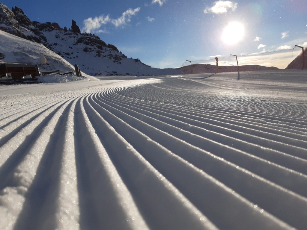 Abbiamo preso la prima funivia della giornata verso Porta Vescovo, con vista sulla Marmolada. In cima la prima foto è stata però scattata alle strisce del gatto della neve.