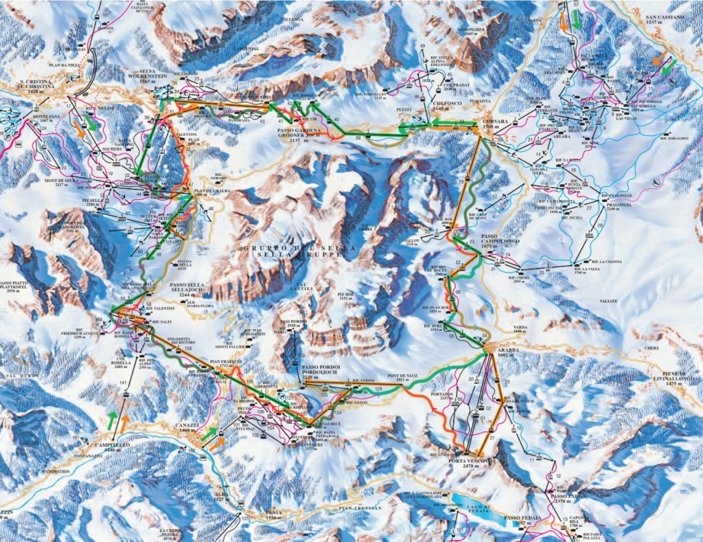 Il Sella Ronda è probabilmente lo skitour più famoso del mondo, che consente di valicare con gli sci 4 passi alpini (Pordoi, Sella, Gardena e Campolongo) e andare in tre province diverse (Belluno, Trento e Bolzano). Il tutto per fare il giro del gruppo montuoso del Sella.