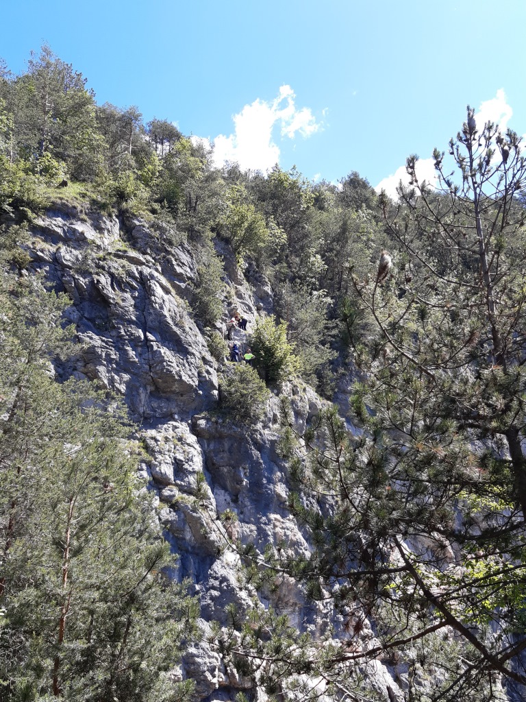 Il rientro è avvenuto per il sentiero nel bosco, in 10-15 minuti. Come spesso accade, il ritorno alla base rappresenta un momento estremamente gratificante, in quanto ti consente di vedere la via della salita. Nel nostro caso abbiamo potuto fare anche una foto al gruppetto di Riccardo sull’ultima rampa della ferrata; come si vede, anche se facile, l’esposizione della via non era affatto banale.