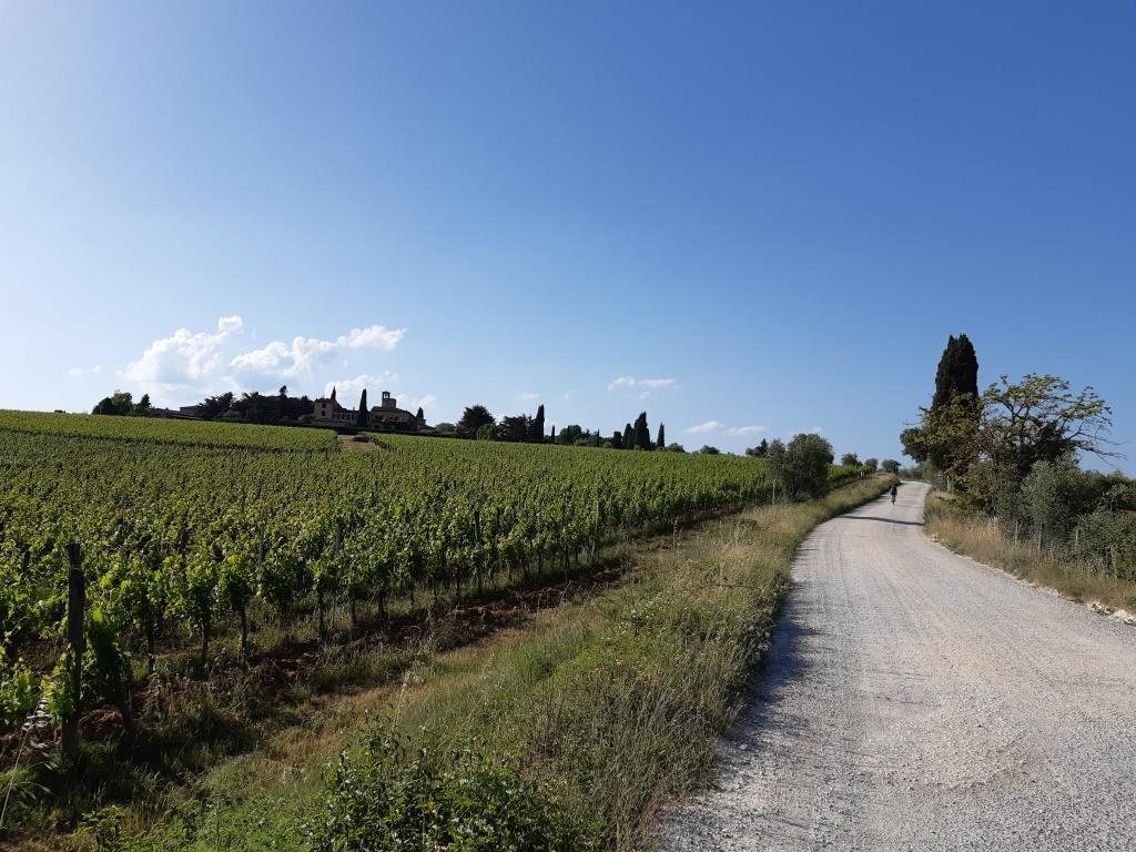 Abbiamo parcheggiato il camper a Torrenieri e un lunghissimo sterrato ci ha portato nel piccolo borgo di Lucignano d’Asso (nella foto qui sotto). Per decine di chilometri abbiamo pedalato immersi nella natura; c’era solo qualche casale o fattoria e niente altro (nelle tappe precedenti c’è sempre stata qualche bruttura dell’uomo a rovinare l’ambiente: qui niente!).