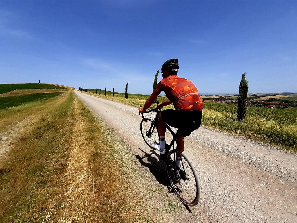 Abbiamo percorso il giro in senso antiorario. Per riprendere la traccia dell’Eroica in località Colle Malamerenda (nella periferia sud di Siena, dove l’avevamo lasciata il giorno precedente), abbiamo percorso la via Francigena in direzione nord, lungo una strada ornata da cipressi, come si vede nelle cartoline.