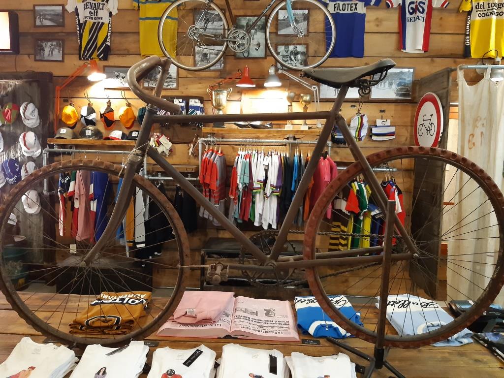 In un wine bar abbiamo tutti e tre mangiato “pappa al pomodoro”; nell’attesa del nostro piatto non ho potuto fare a meno di notare come il 90% delle persone sedute nei vari locali della piazza di Gaiole fossero cicloturisti. Il negozio di fronte al nostro wine bar era lo shop ufficiale dell’Eroica: è arredato meravigliosamente, con bici, accessori e capi vintage. Insomma, eravamo “carichi abbestia”.