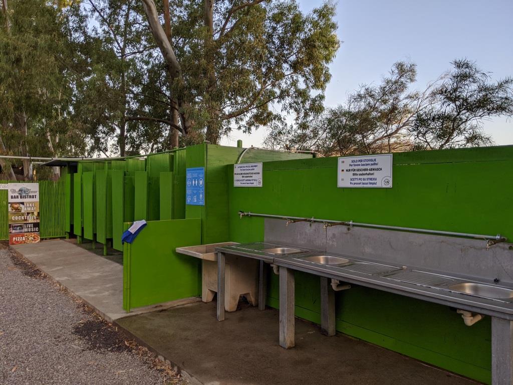 C’è anche uno spartano blocco servizi con docce calde che funzionano con monete da 50 centesimi.