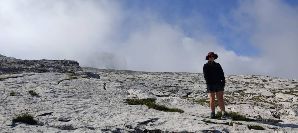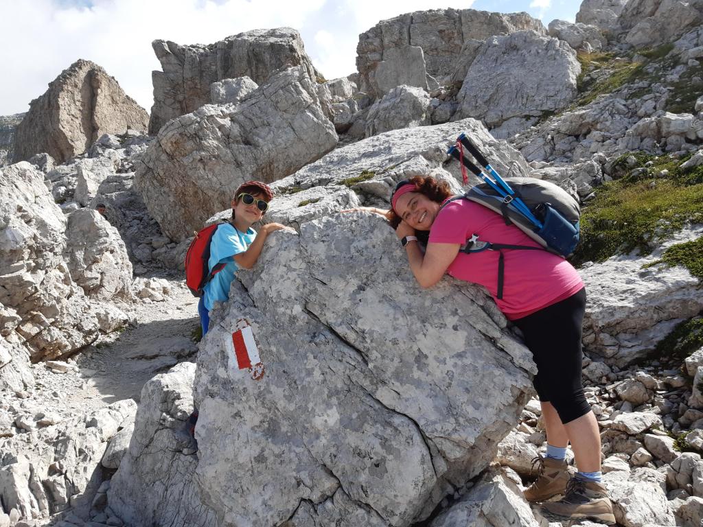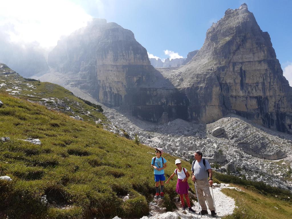 Dal Grostè al rifugio Tuckett il sentiero scende complessivamente di circa 300 metri, ma c’è un continuo saliscendi che consente di trovare diversi angoli per scattare le foto ricordo (qui sotto Ludovica con lo sfondo della Pietra Grande).