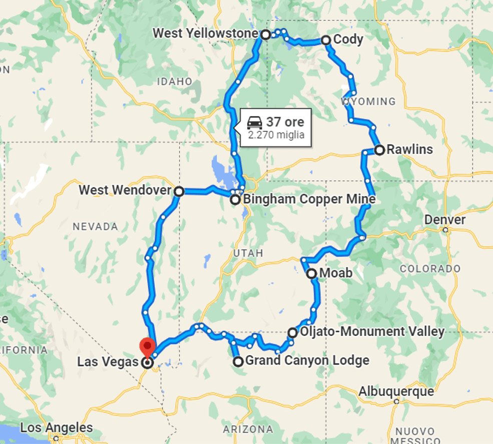Poi con volo interno siamo andati a Las Vegas, dove abbiamo noleggiato un’automobile per fare un grande anello nell’ovest degli Stati Uniti passando per Salt Lake City, Yellowstone, Cody, Moab (Arches e off-road a Canyonlands), Monument Valley, Page, Grand Canyon, prima di tornare a Las Vegas per visitare gli hotel – casinò e fare un po’ di shopping. Siamo rientrati in Italia da Las Vegas, dopo aver guidato per circa 4.500 km.