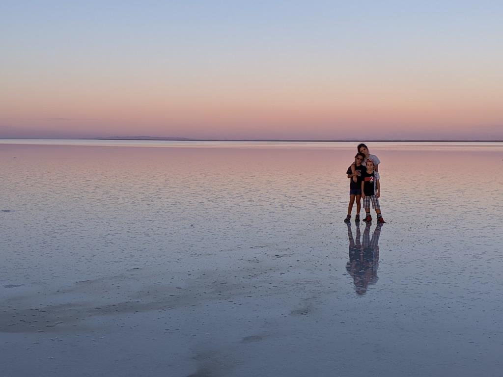 Al tramonto abbiamo camminato su una crosta di sale bianca, lucida e riflettente, circondati da montagne.