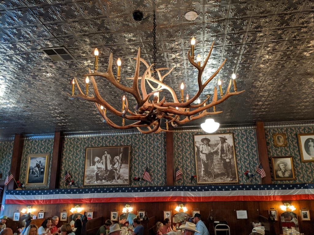 Il lampadario principale era in corna di cervo. Per la cronaca, il piatto che abbiamo preferito sono state le costicine di bufalo.