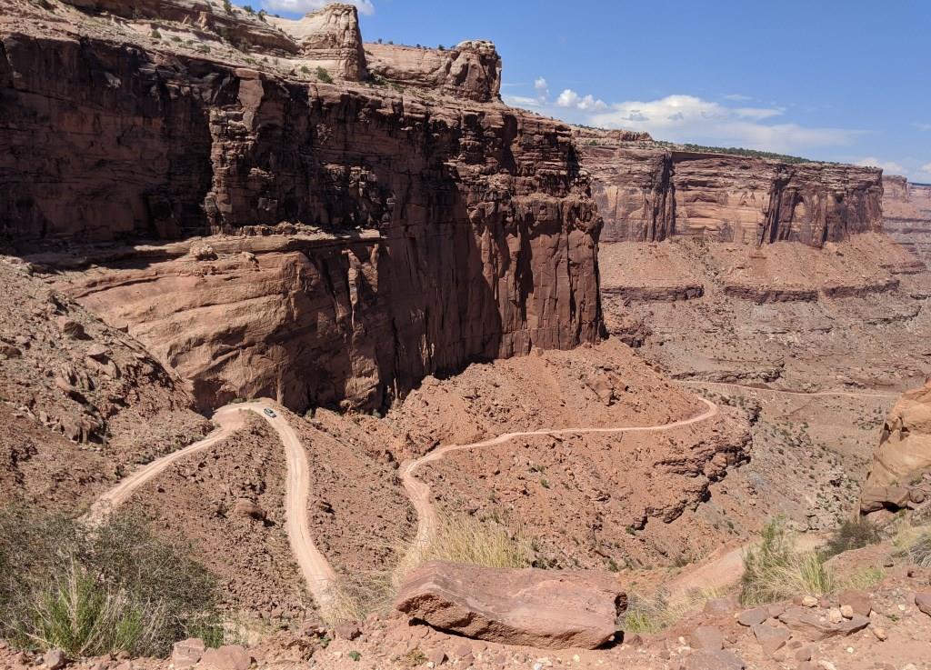 Sempre nel Dead Horse point, abbiamo percorso il sentiero che costeggia la riva verso il Shafer Valley Overlook, per un totale di circa 3 km andata e ritorno. Anche da questo punto era eccitante vedere la traccia della strada sterrata che avremmo percorso in jeep nel pomeriggio.
