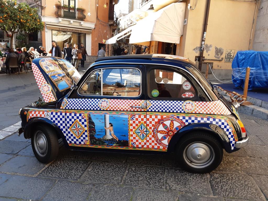 Ed invero, di fronte a Palazzo Corvaja la nostra attenzione è stata attratta da una FIAT 500 “sicula”. I turisti stranieri erano letteralmente impazziti.