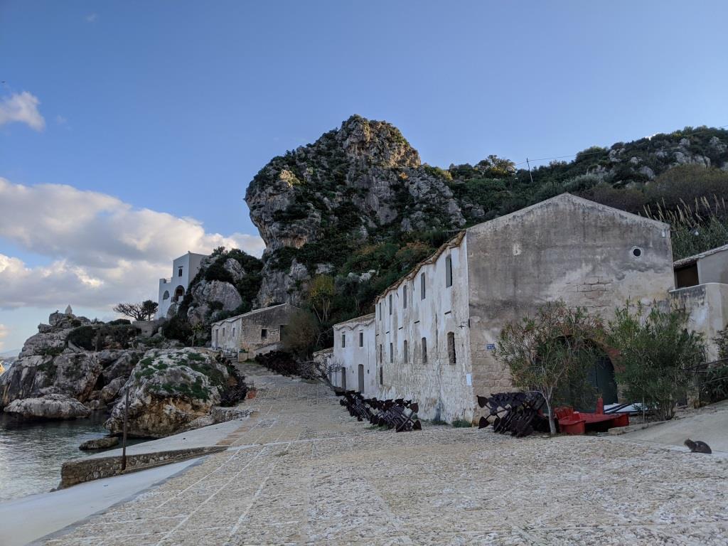 Abbiamo parcheggiato il camper lungo la strada provinciale dato che tutti i parcheggi, compresi quelli a pagamento, erano chiusi. Siamo quindi scesi lungo una ripida strada carrabile che ci ha portato all’ingresso della tonnara dove abbiamo pagato il biglietto (€ 10 ad adulto). Mano a mano che scendevamo ci rendevamo conto perché questo luogo è così famoso: sorge in un’insenatura incorniciata da ripide scogliere, i faraglioni sbucano dal mare a pochi metri dal porticciolo.