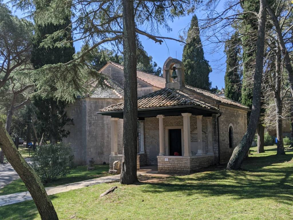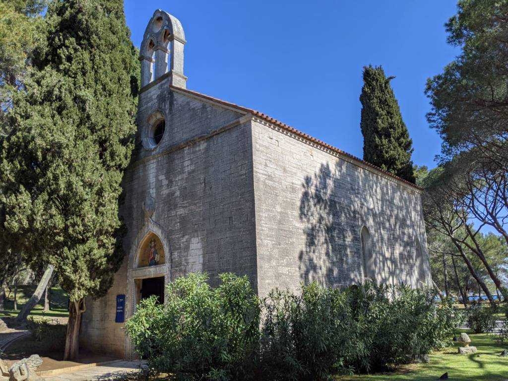 Al suo interno è posto un mosaico ritrovato nei resti delle costruzioni romane presenti nell’isola e una pietra con iscrizioni nell’antica lingua slava.