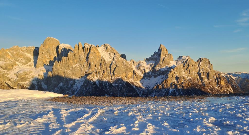 Anche in pieno giorno l’area sosta è tranquilla perché fuori dal caos delle automobili; chiusi gli impianti il luogo diventa deserto e silenzioso, e si può ammirare in tutta serenità il tramonto sulle Pale di San Martino.