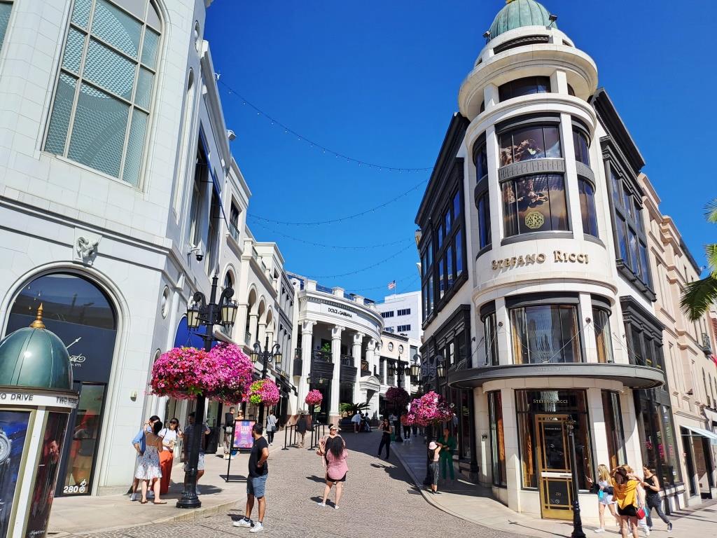 Arrivati a Rodeo Drive, come previsto, il quartiere era affollato di auto e pedoni. Abbiamo cercato disperatamente un posto dove parcheggiare, ma ogni parcheggio sembrava essere pieno o riservato ai clienti dei negozi. Dopo diversi giri e alcuni tentativi frustranti, finalmente siamo riusciti a trovare un posto disponibile, anche se un po’ lontano dai negozi principali. Abbiamo finalmente iniziato a esplorare Rodeo Drive a piedi, ammirando le vetrine delle boutique di alta moda e gioielli: ci sentivamo in un mondo di lusso e glamour, mentre le vetrine sfoggiano abiti e accessori costosi che fanno brillare gli occhi.