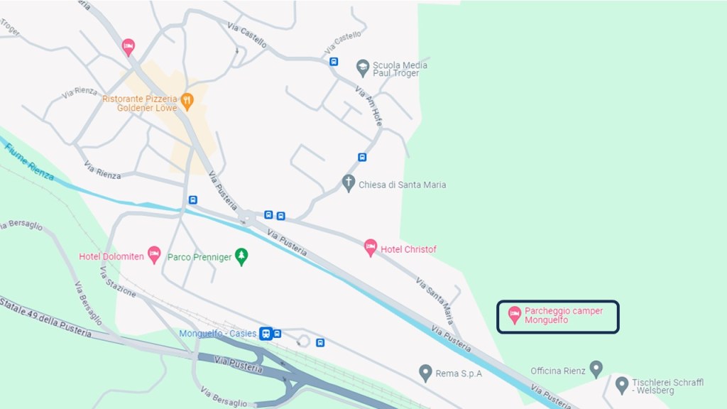 L’area sosta in parola è molto comoda per visitare Monguelfo, che si raggiunge a piedi in meno di 5 minuti. Qui ci sono bar, ristoranti, bei negozi, supermercati.