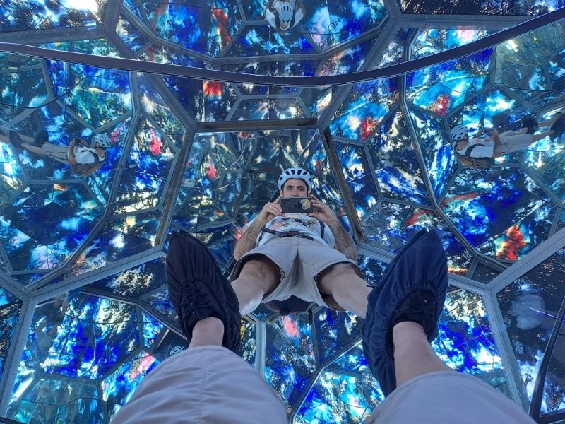 Per pranzo ci siamo fermati a Broens Street Food, un’area gastronomica all’aperto frequentata sia da turisti che da locali. Tra i vari stand abbiamo notato una strana costruzione geometrica: una sorta di padiglione temporaneo, tutto in metallo e vetro. Dentro, sorpresa: un’installazione d’arte contemporanea dove l’intera parete interna era ricoperta di specchi, creando un gioco di riflessi che moltiplicava spazio, luci e persone. Un piccolo attacco d’arte in mezzo a un mercato di cibo di strada — tipicamente danese.