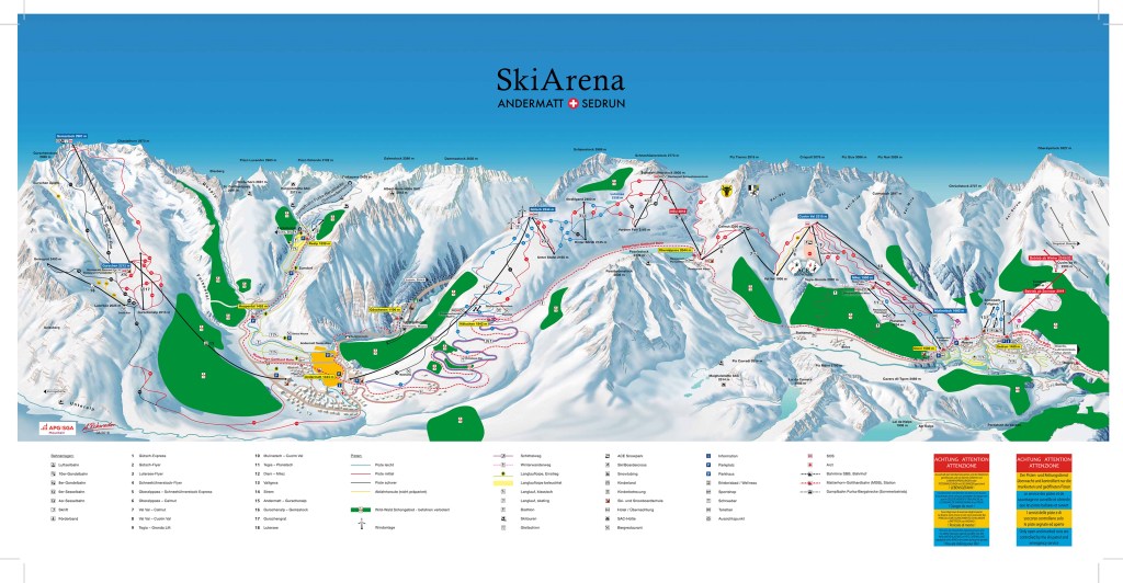 Ad Andermatt abbiamo scelto di sciare sul versante verso Sedrun, nel comprensorio Andermatt-Sedrun-Disentis: un’area ampia e moderna, con piste lunghe e tecniche che si sviluppano tra i 1.400 e quasi 3.000 metri di quota. Qui impianti di recente costruzione portano fino ai paesi di Dieni e Sedrun attraverso l’Oberalpass.