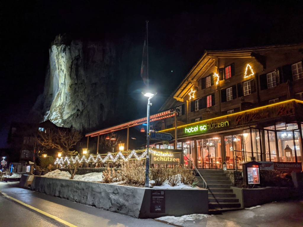 Finito di sciare verso le 15.30, abbiamo ripreso il viaggio verso la sede ufficiale del weekend: Wengen e la Jungfrau ski region. In serata abbiamo raggiunto il paesino di Lauterbrunnen, incastonato nella sua valle stretta e verticale. Abbiamo scelto questo luogo e perché era l’unico con prezzo abbordabili, e perchè è l’ulitmo paese raggiungibile con l’automobile. Abbiamo alloggiato all’Hotel Schützen, struttura storica e accogliente.