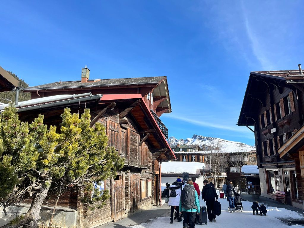 Dopo le ultime discese siamo scesi a Mürren per pranzo. Anche questo villaggio è senza automobili, con chalet in legno, stradine curate e una vista costante sulle grandi cime dell’Oberland. L’atmosfera è raccolta e autentica, quasi sospesa nel tempo.